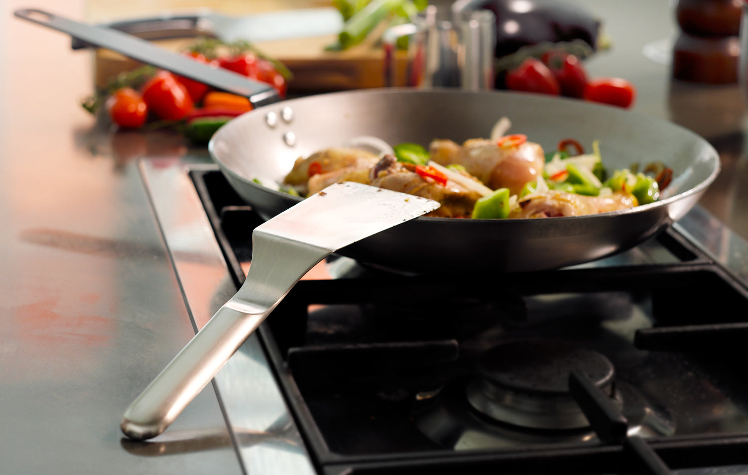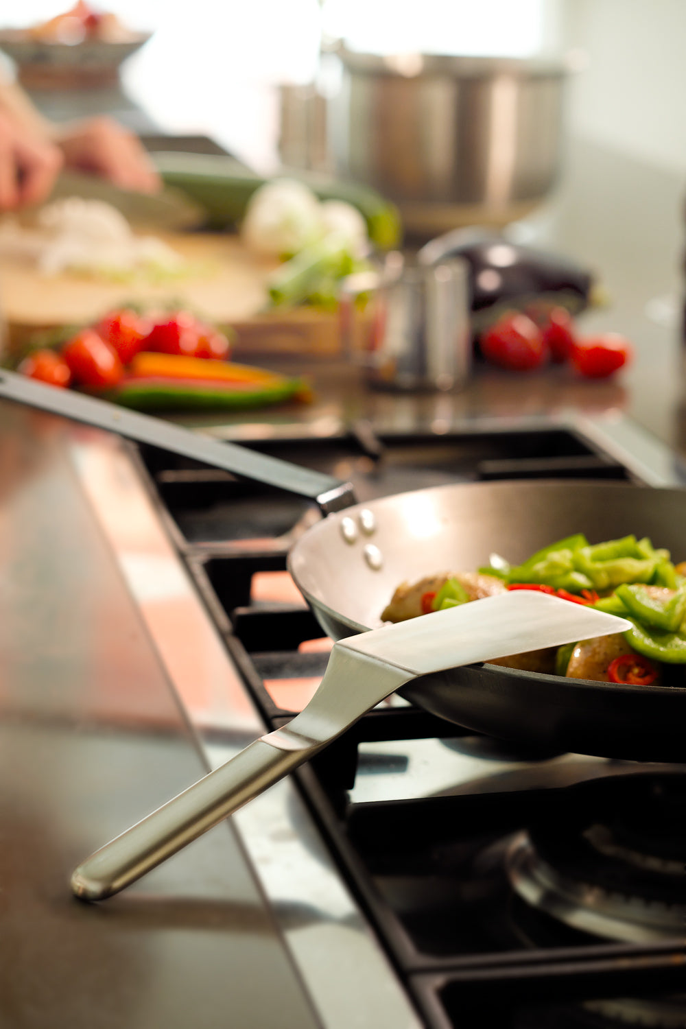 Professional Secrets' spatula is thin and supple with an extra fine and tapering finish. However, the outer edge is somewhat rounded to avoid the the steel being so sharp that it gets stuck in – or even damages – the protective layer in a broken-in steel frying pan.
